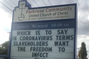 This is a reference to President Trump’s and his supporters’ resistance to wearing face masks during the Covid-19 pandemic and the disproportionate effect that the virus has had on the relatively poorer black community.  The statement equates Trump and his conservative, mostly white and mostly wealthy supporters with the slaveholders of past centuries.  This is an intentionally hyperbolic extrapolation of the black community’s complaint that the economic and political hegemony of the relatively wealthy, white community continues to subjugate the black community.  I don’t endorse or accept the church sign’s literal message, but by provocation at least it reminds me that the black community in general has a valid gripe against the status quo.  Against the attitude that “That’s just the way it is.”  Which is why I, like Portland’s “liberal” leadership, continue to condone the nightly BLM protests.